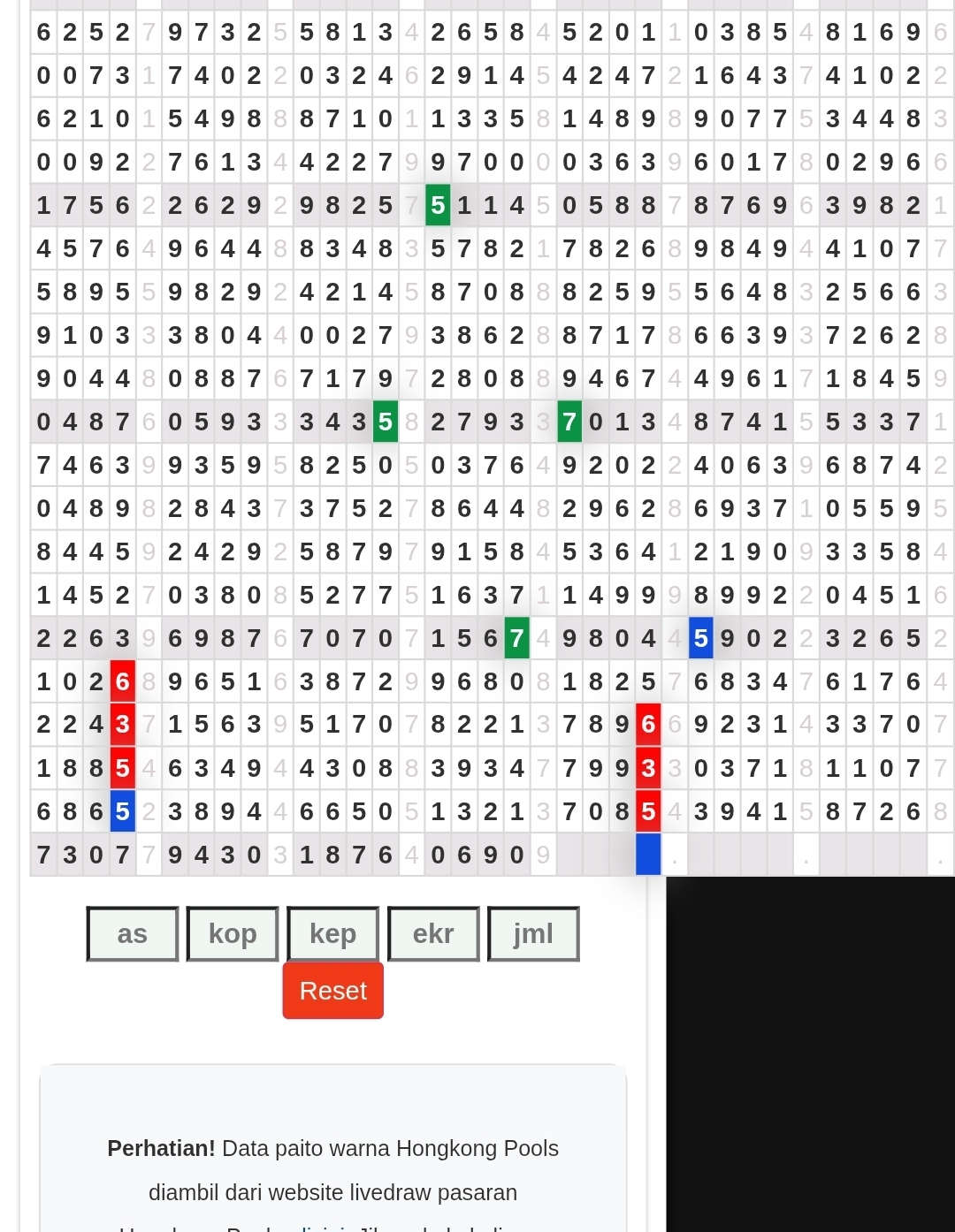 | Rumus Angka Mati berdasarkan kepala harian | 04 06 07 09 10 18 19 20 21 29 30 31 32 42 43 50 51 53 54 61 62 64 71 72 73 74 75 76 82 83 84 85 86 87 93 94 95 96 98 |