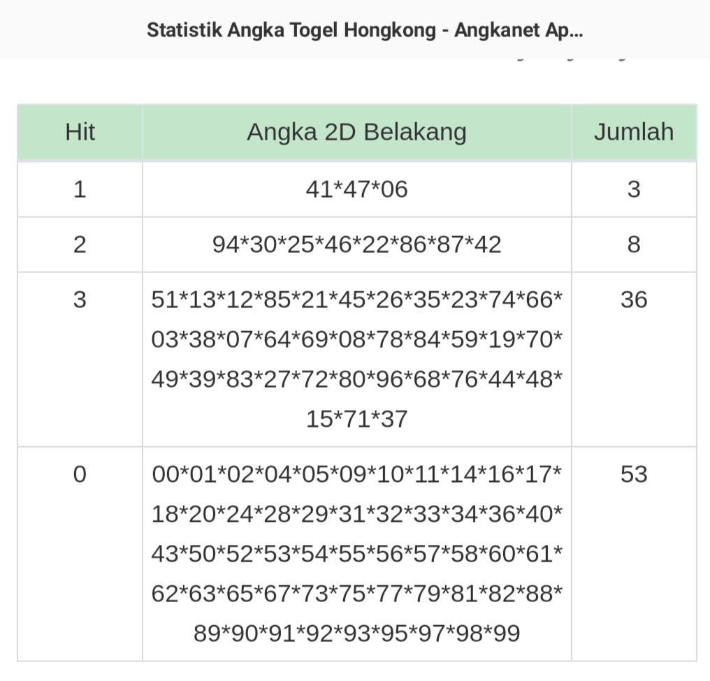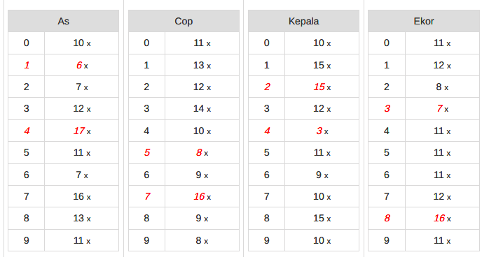 | Rumus Angka Mati berdasarkan kepala harian | 04 05 06 07 08 09 10 15 16 17 18 21 26 28 29 30 31 32 41 42 43 52 53 54 64 65 72 73 75 76 83 84 86 93 94 95 96 97 98 |