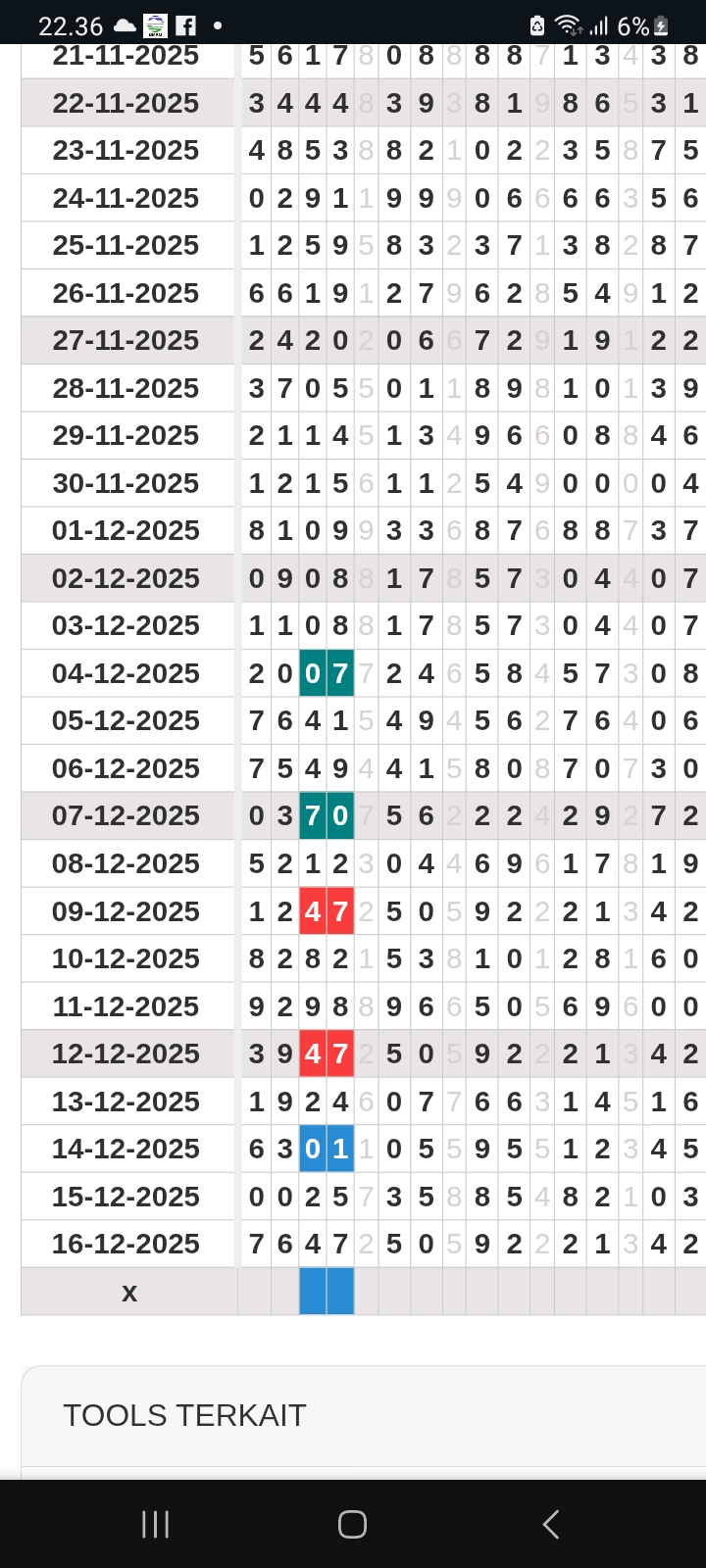 | Rumus Angka Mati berdasarkan kepala harian | 05 06 08 10 15 16 17 18 19 20 21 26 27 28 29 30 32 37 38 39 40 41 43 48 52 53 54 63 64 65 74 75 76 86 87 94 95 97 98 |