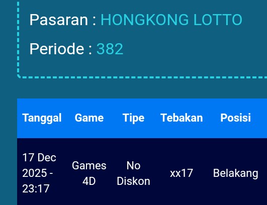 Prediksi Hongkong Lotto Kamis, 18-12-2025 Merupakan Prediksi Otomatis yang menggabungkan Metode Kalender Togel Dengan LN Generator yang akurasi prediksinya sudah kita ketahui bersama. Jadi harap Maklum Jika kadang meleset Prediksi Hongkong Lotto kita. Jadikan ini sebagai perbandingan saja dan tetap Utamakan karya sendiri