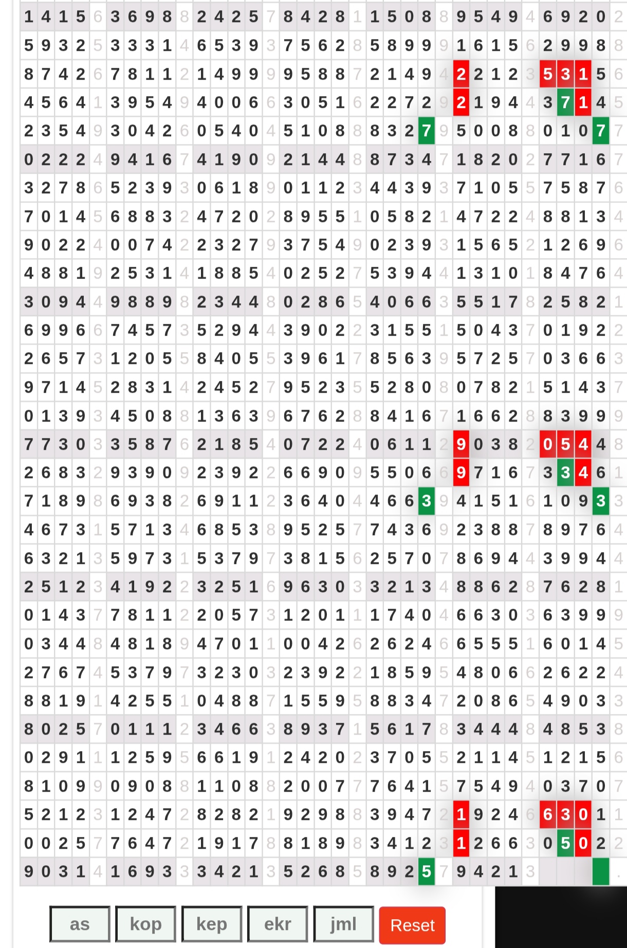 | Rumus Angka Mati berdasarkan kepala harian | 05 06 08 09 16 17 19 20 21 26 27 28 29 30 31 32 37 38 39 40 41 43 48 49 51 52 54 59 63 64 65 74 75 76 85 86 87 97 98 |