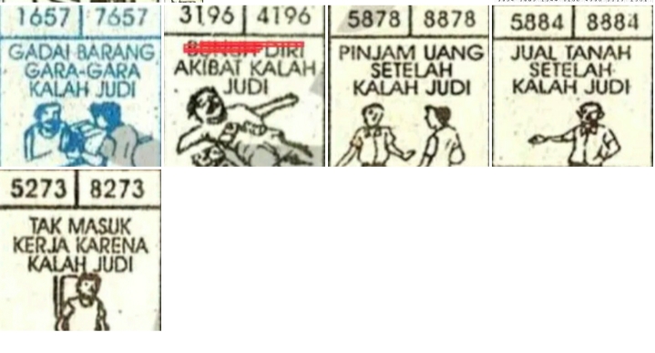 | Rumus Angka Mati berdasarkan kepala harian | 04 05 06 07 08 09 10 15 16 17 18 21 26 28 29 30 31 32 41 42 43 52 53 54 64 65 72 73 75 76 83 84 86 93 94 95 96 97 98 |