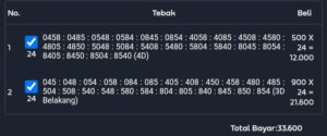 | Rumus Angka Mati berdasarkan kepala harian | 05 06 08 09 16 17 19 20 21 26 27 28 29 30 31 32 37 38 39 40 41 43 48 49 51 52 54 59 63 64 65 74 75 76 85 86 87 97 98 |