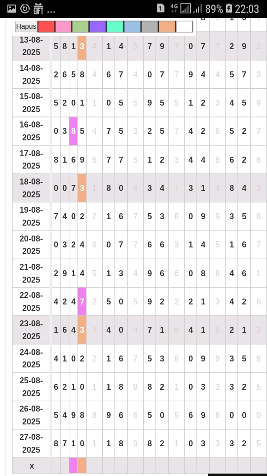| Rumus Angka Mati berdasarkan kepala harian | 05 06 08 09 16 17 19 20 21 26 27 28 29 30 31 32 37 38 39 40 41 43 48 49 51 52 54 59 63 64 65 74 75 76 85 86 87 97 98 |