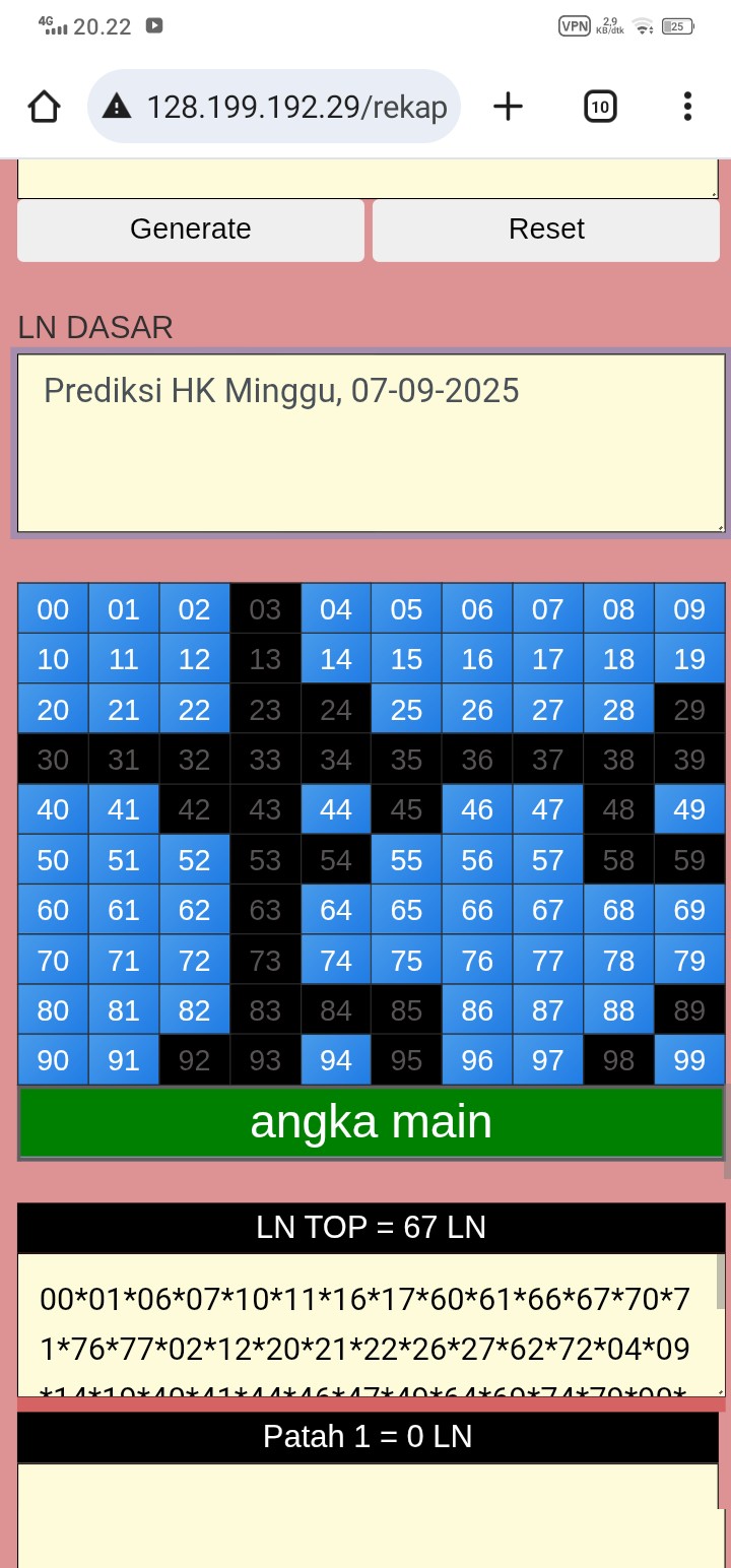 | Rumus Angka Mati berdasarkan kepala harian | 05 06 08 09 16 17 19 20 21 26 27 28 29 30 31 32 37 38 39 40 41 43 48 49 51 52 54 59 63 64 65 74 75 76 85 86 87 97 98 |