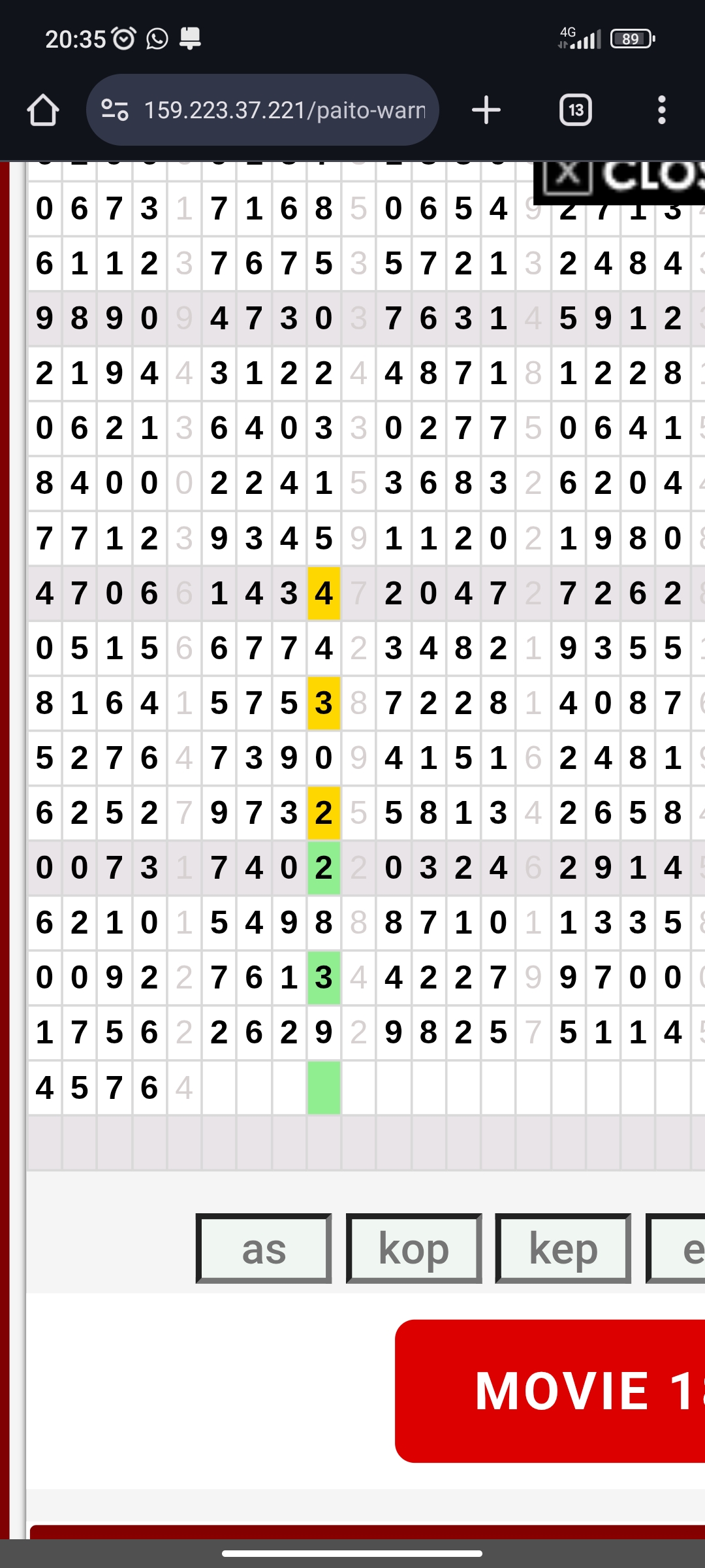 | Rumus Angka Mati berdasarkan kepala harian | 05 06 08 09 16 17 19 20 21 26 27 28 29 30 31 32 37 38 39 40 41 43 48 49 51 52 54 59 63 64 65 74 75 76 85 86 87 97 98 |