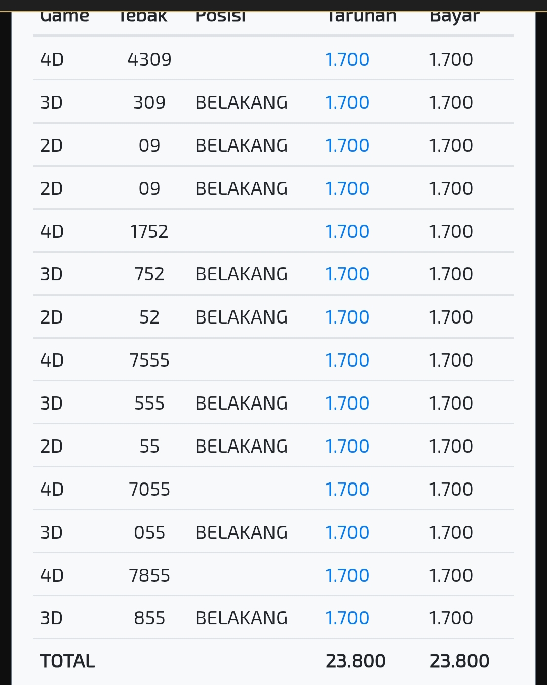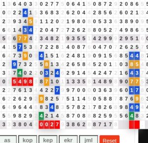 | Rumus Angka Mati berdasarkan kepala harian | 05 06 08 09 16 17 19 20 21 26 27 28 29 30 31 32 37 38 39 40 41 43 48 49 51 52 54 59 63 64 65 74 75 76 85 86 87 97 98 |