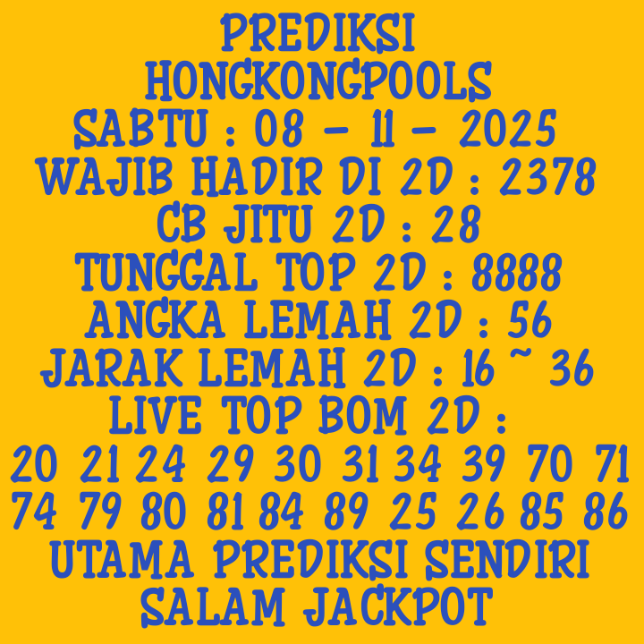 Prediksi HK Sabtu, 08-11-2025 Merupakan Prediksi Otomatis yang menggabungkan Metode Kalender Togel Dengan LN Generator yang akurasi prediksinya sudah kita ketahui bersama. Jadi harap Maklum Jika kadang meleset Prediksi HK kita. Jadikan ini sebagai perbandingan saja dan tetap Utamakan karya sendiri