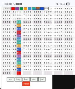 | Rumus Angka Mati berdasarkan kepala harian | 04 06 07 09 10 18 19 20 21 29 30 31 32 42 43 50 51 53 54 61 62 64 71 72 73 74 75 76 82 83 84 85 86 87 93 94 95 96 98 |