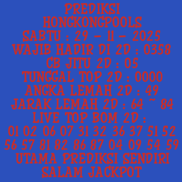 Prediksi HK Selasa, 02-12-2025 Merupakan Prediksi Otomatis yang menggabungkan Metode Kalender Togel Dengan LN Generator yang akurasi prediksinya sudah kita ketahui bersama. Jadi harap Maklum Jika kadang meleset Prediksi HK kita. Jadikan ini sebagai perbandingan saja dan tetap Utamakan karya sendiri