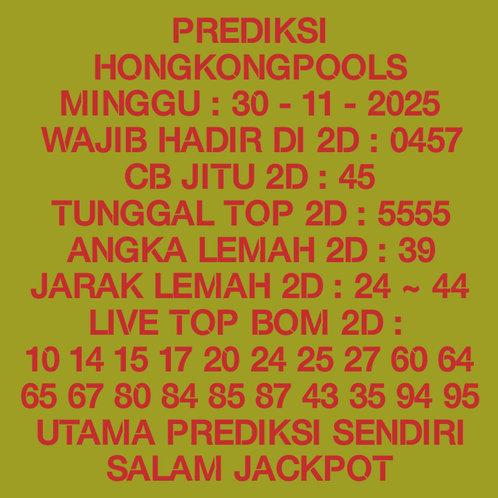 Prediksi HK Minggu, 30-11-2025 Merupakan Prediksi Otomatis yang menggabungkan Metode Kalender Togel Dengan LN Generator yang akurasi prediksinya sudah kita ketahui bersama. Jadi harap Maklum Jika kadang meleset Prediksi HK kita. Jadikan ini sebagai perbandingan saja dan tetap Utamakan karya sendiri