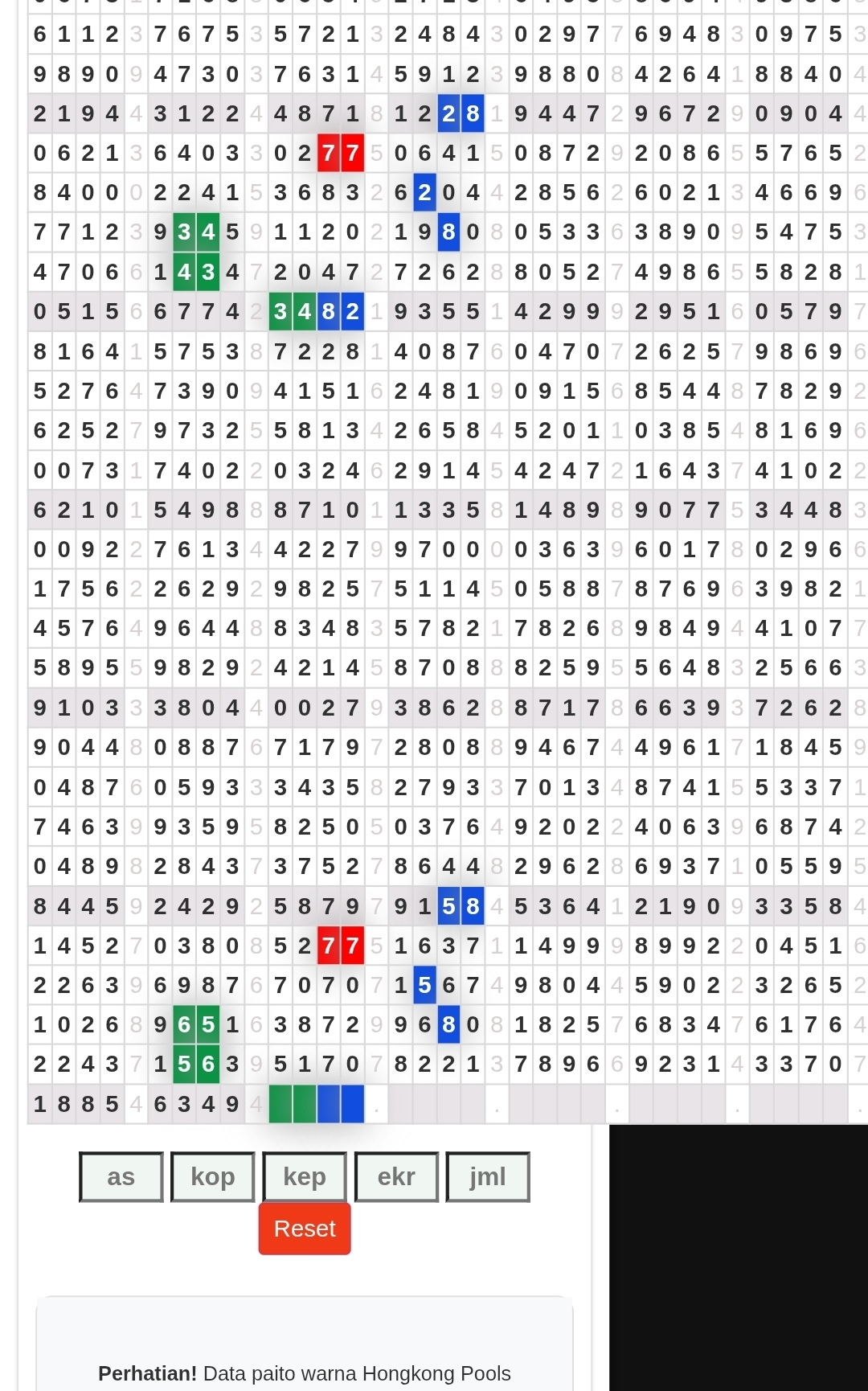 | Rumus Angka Mati berdasarkan kepala harian | 05 06 08 09 16 17 19 20 21 26 27 28 29 30 31 32 37 38 39 40 41 43 48 49 51 52 54 59 63 64 65 74 75 76 85 86 87 97 98 |