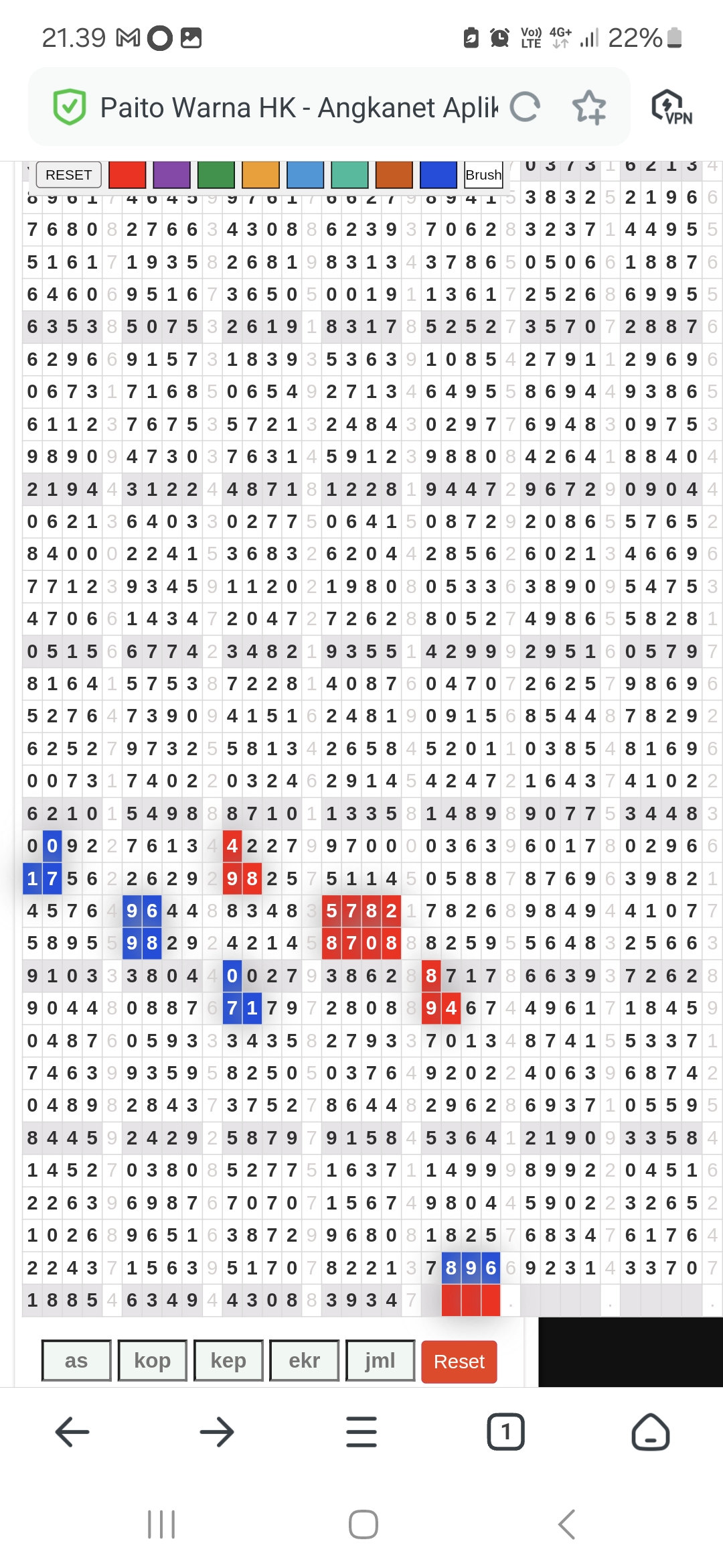 | Rumus Angka Mati berdasarkan kepala harian | 08 09 10 16 17 19 20 27 28 30 31 32 37 38 39 40 41 42 43 48 49 50 51 52 54 59 60 62 63 65 74 75 76 85 86 87 96 97 98 |