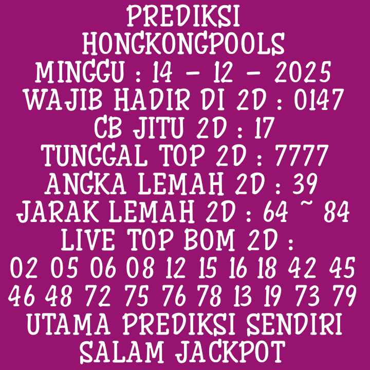 Selamat Bergabung kembali bersama angkanet dalam room Prediksi HK. Untuk kenyamanan dalam berprediksi, kami melarang adanya posting nomor WA, Web atau FB. Angkanet juga tidak pernah menjual prediksi, software, atau aplikasi togel lainnya. Berprediksilah secara damai dan elegan. Terima kasih telah menjadi pengunjung setia angkanet