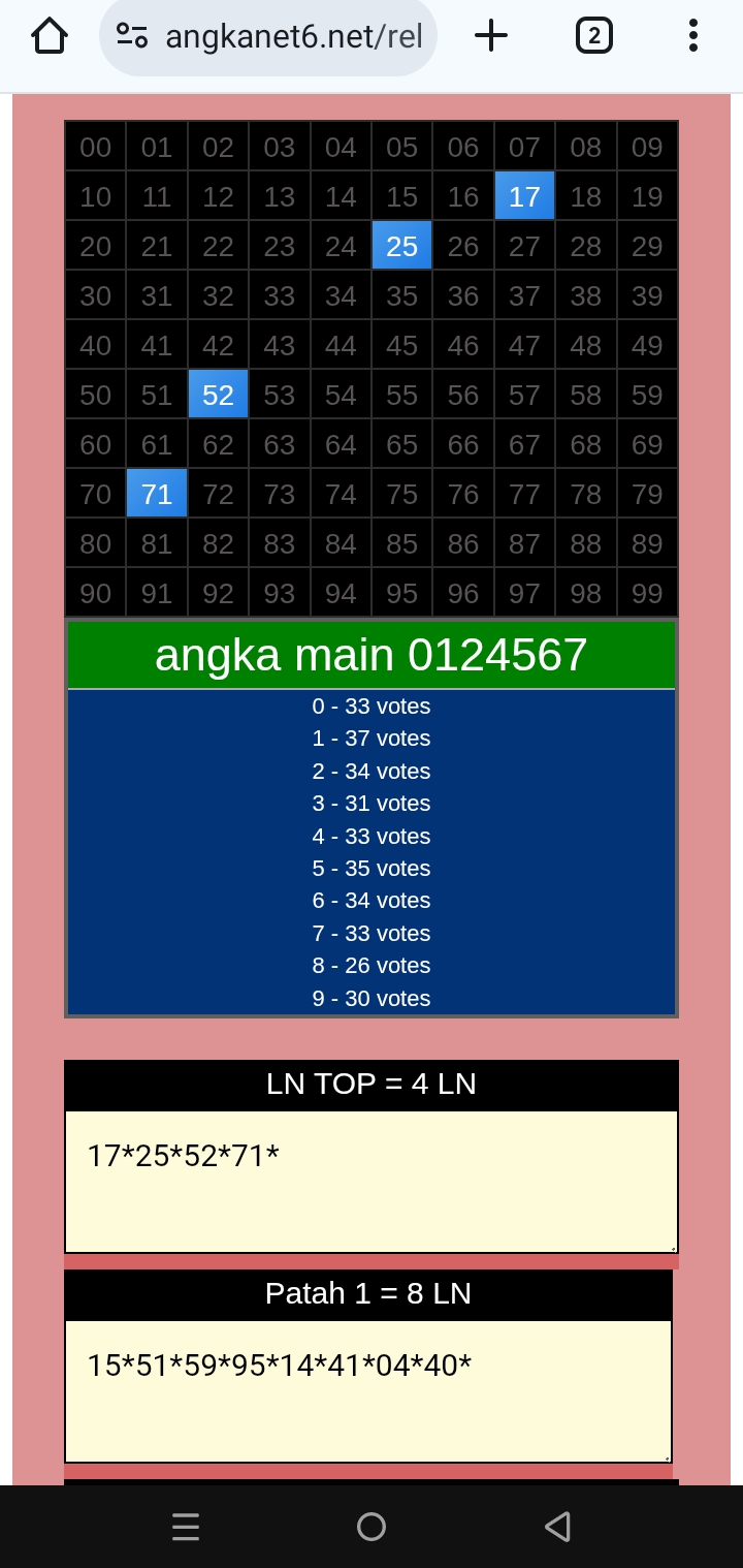 | Rumus Angka Mati berdasarkan kepala harian | 04 06 07 09 10 18 19 20 21 29 30 31 32 42 43 50 51 53 54 61 62 64 71 72 73 74 75 76 82 83 84 85 86 87 93 94 95 96 98 |