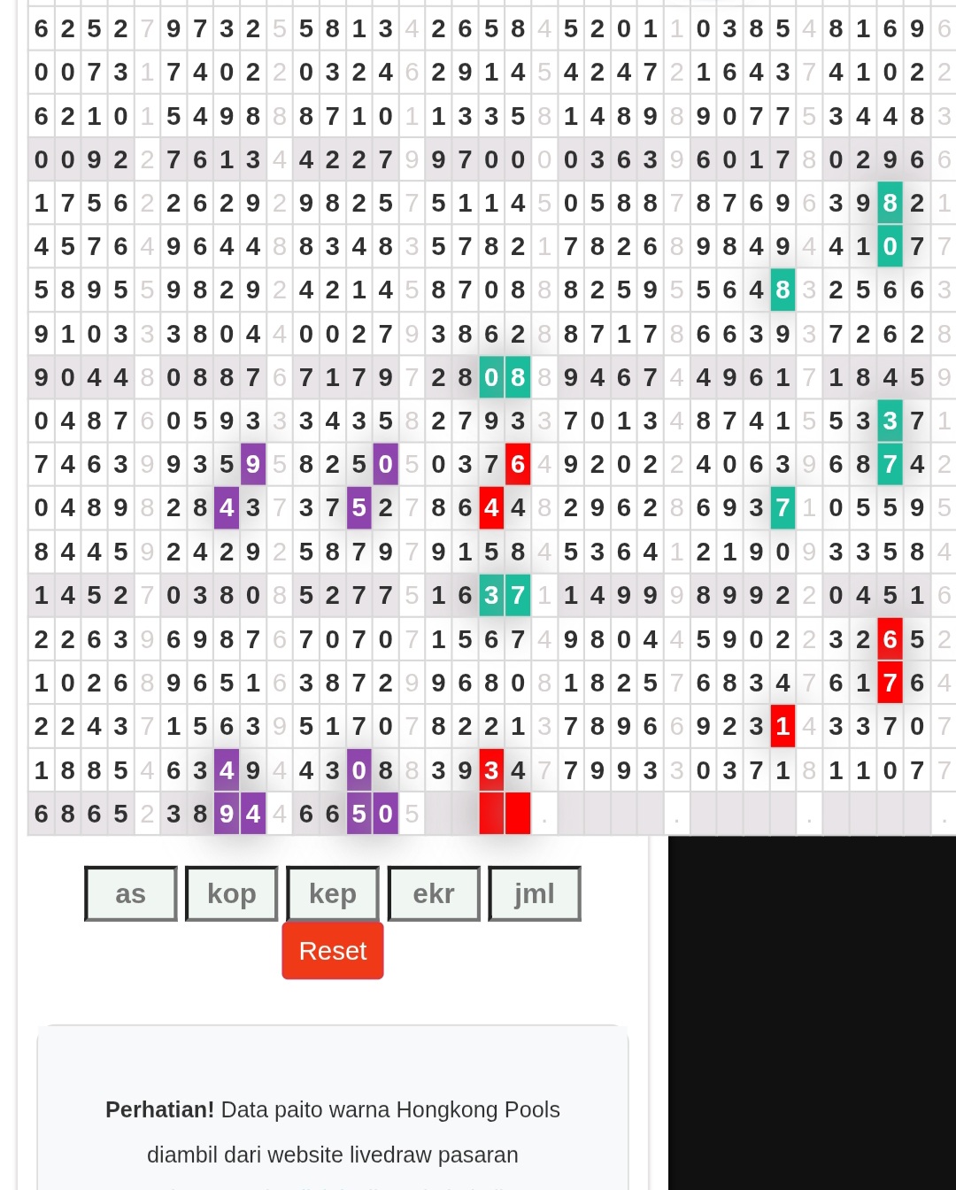 | Rumus Angka Mati berdasarkan kepala harian | 05 06 08 09 16 17 19 20 21 26 27 28 29 30 31 32 37 38 39 40 41 43 48 49 51 52 54 59 63 64 65 74 75 76 85 86 87 97 98 |