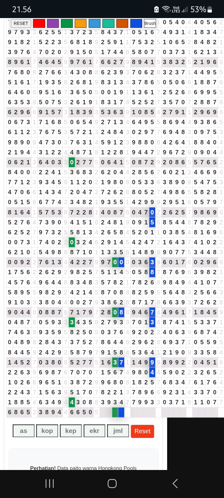 | Rumus Angka Mati berdasarkan kepala harian | 05 06 08 09 16 17 19 20 21 26 27 28 29 30 31 32 37 38 39 40 41 43 48 49 51 52 54 59 63 64 65 74 75 76 85 86 87 97 98 |