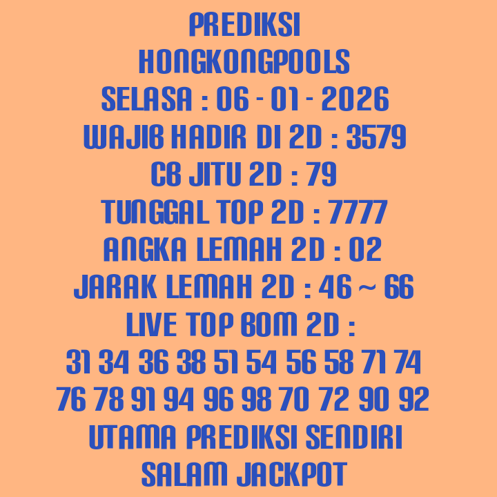 Prediksi HK Selasa, 06-01-2026 Merupakan Prediksi Otomatis yang menggabungkan Metode Kalender Togel Dengan LN Generator yang akurasi prediksinya sudah kita ketahui bersama. Jadi harap Maklum Jika kadang meleset Prediksi HK kita. Jadikan ini sebagai perbandingan saja dan tetap Utamakan karya sendiri