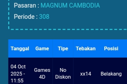 Prediksi Magnum Cambodia Rabu, 05-11-2025 Merupakan Prediksi Otomatis yang menggabungkan Metode Kalender Togel Dengan LN Generator yang akurasi prediksinya sudah kita ketahui bersama. Jadi harap Maklum Jika kadang meleset Prediksi Magnum Cambodia kita. Jadikan ini sebagai perbandingan saja dan tetap Utamakan karya sendiri