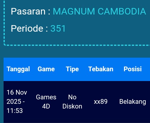 Prediksi Magnum Cambodia Senin, 17-11-2025 Merupakan Prediksi Otomatis yang menggabungkan Metode Kalender Togel Dengan LN Generator yang akurasi prediksinya sudah kita ketahui bersama. Jadi harap Maklum Jika kadang meleset Prediksi Magnum Cambodia kita. Jadikan ini sebagai perbandingan saja dan tetap Utamakan karya sendiri