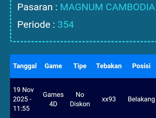 Prediksi Magnum Cambodia Jumat, 21-11-2025 Merupakan Prediksi Otomatis yang menggabungkan Metode Kalender Togel Dengan LN Generator yang akurasi prediksinya sudah kita ketahui bersama. Jadi harap Maklum Jika kadang meleset Prediksi Magnum Cambodia kita. Jadikan ini sebagai perbandingan saja dan tetap Utamakan karya sendiri