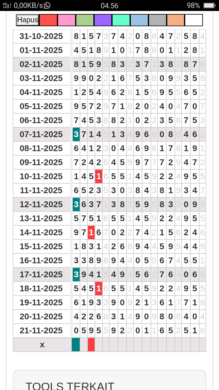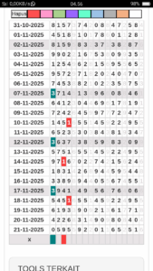 | Rumus Angka Mati berdasarkan kepala harian | 08 09 10 16 17 19 20 27 28 30 31 32 37 38 39 40 41 42 43 48 49 50 51 52 54 59 60 62 63 65 74 75 76 85 86 87 96 97 98 |