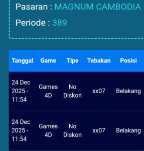 Prediksi Magnum Cambodia Rabu, 24-12-2025 Merupakan Prediksi Otomatis yang menggabungkan Metode Kalender Togel Dengan LN Generator yang akurasi prediksinya sudah kita ketahui bersama. Jadi harap Maklum Jika kadang meleset Prediksi Magnum Cambodia kita. Jadikan ini sebagai perbandingan saja dan tetap Utamakan karya sendiri