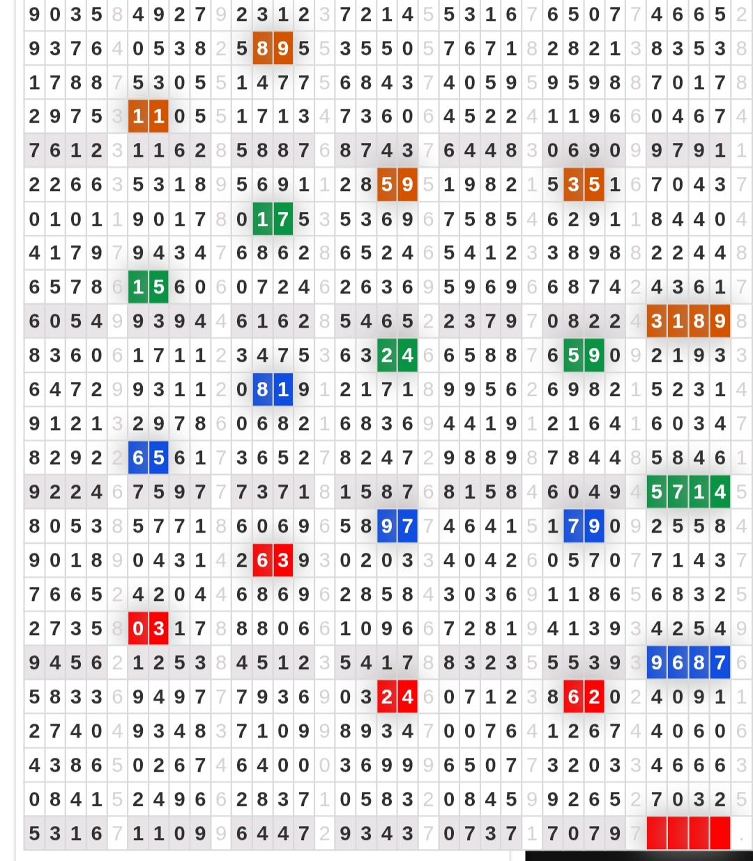 | Rumus Angka Mati berdasarkan kepala harian | 04 05 06 07 08 09 10 15 16 17 18 19 21 26 27 28 29 30 32 37 39 41 42 43 52 53 54 63 64 65 75 76 83 84 86 87 94 95 97 |
