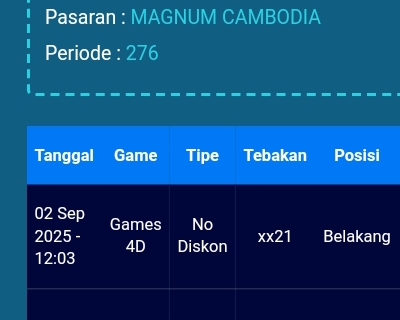 Prediksi Magnum Cambodia Kamis, 06-11-2025 Merupakan Prediksi Otomatis yang menggabungkan Metode Kalender Togel Dengan LN Generator yang akurasi prediksinya sudah kita ketahui bersama. Jadi harap Maklum Jika kadang meleset Prediksi Magnum Cambodia kita. Jadikan ini sebagai perbandingan saja dan tetap Utamakan karya sendiri
