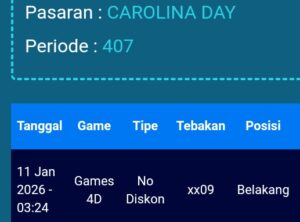 Prediksi North Carolina Day Jumat, 09-01-2026 Merupakan Prediksi Otomatis yang menggabungkan Metode Kalender Togel Dengan LN Generator yang akurasi prediksinya sudah kita ketahui bersama. Jadi harap Maklum Jika kadang meleset Prediksi North Carolina Day kita. Jadikan ini sebagai perbandingan saja dan tetap Utamakan karya sendiri