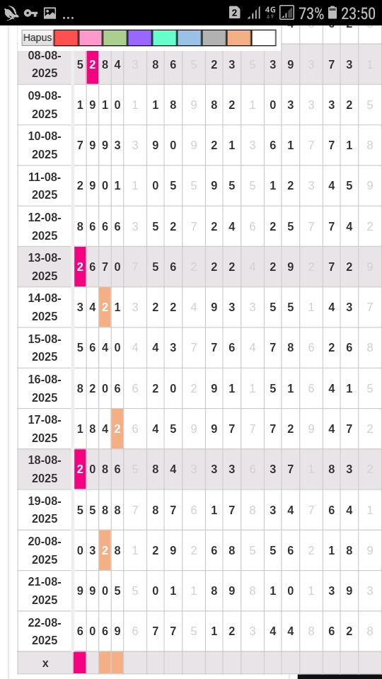| Rumus Angka Mati berdasarkan kepala harian | 05 06 08 10 15 16 17 18 19 20 21 26 27 28 29 30 32 37 38 39 40 41 43 48 52 53 54 63 64 65 74 75 76 86 87 94 95 97 98 |
