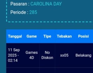 Prediksi North Carolina Day Selasa, 04-11-2025 Merupakan Prediksi Otomatis yang menggabungkan Metode Kalender Togel Dengan LN Generator yang akurasi prediksinya sudah kita ketahui bersama. Jadi harap Maklum Jika kadang meleset Prediksi North Carolina Day kita. Jadikan ini sebagai perbandingan saja dan tetap Utamakan karya sendiri