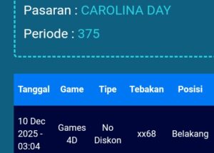 Prediksi North Carolina Day Minggu, 23-11-2025 Merupakan Prediksi Otomatis yang menggabungkan Metode Kalender Togel Dengan LN Generator yang akurasi prediksinya sudah kita ketahui bersama. Jadi harap Maklum Jika kadang meleset Prediksi North Carolina Day kita. Jadikan ini sebagai perbandingan saja dan tetap Utamakan karya sendiri