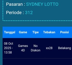 Prediksi Sydney Lotto Rabu, 05-11-2025 Merupakan Prediksi Otomatis yang menggabungkan Metode Kalender Togel Dengan LN Generator yang akurasi prediksinya sudah kita ketahui bersama. Jadi harap Maklum Jika kadang meleset Prediksi Sydney Lotto kita. Jadikan ini sebagai perbandingan saja dan tetap Utamakan karya sendiri
