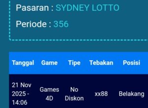 Prediksi Sydney Lotto Sabtu, 22-11-2025 Merupakan Prediksi Otomatis yang menggabungkan Metode Kalender Togel Dengan LN Generator yang akurasi prediksinya sudah kita ketahui bersama. Jadi harap Maklum Jika kadang meleset Prediksi Sydney Lotto kita. Jadikan ini sebagai perbandingan saja dan tetap Utamakan karya sendiri