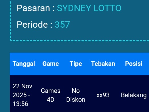 Prediksi Sydney Lotto Minggu, 23-11-2025 Merupakan Prediksi Otomatis yang menggabungkan Metode Kalender Togel Dengan LN Generator yang akurasi prediksinya sudah kita ketahui bersama. Jadi harap Maklum Jika kadang meleset Prediksi Sydney Lotto kita. Jadikan ini sebagai perbandingan saja dan tetap Utamakan karya sendiri
