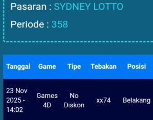 Prediksi Sydney Lotto Minggu, 23-11-2025 Merupakan Prediksi Otomatis yang menggabungkan Metode Kalender Togel Dengan LN Generator yang akurasi prediksinya sudah kita ketahui bersama. Jadi harap Maklum Jika kadang meleset Prediksi Sydney Lotto kita. Jadikan ini sebagai perbandingan saja dan tetap Utamakan karya sendiri