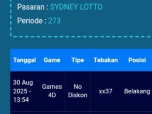 Prediksi Sydney Lotto Rabu, 05-11-2025 Merupakan Prediksi Otomatis yang menggabungkan Metode Kalender Togel Dengan LN Generator yang akurasi prediksinya sudah kita ketahui bersama. Jadi harap Maklum Jika kadang meleset Prediksi Sydney Lotto kita. Jadikan ini sebagai perbandingan saja dan tetap Utamakan karya sendiri