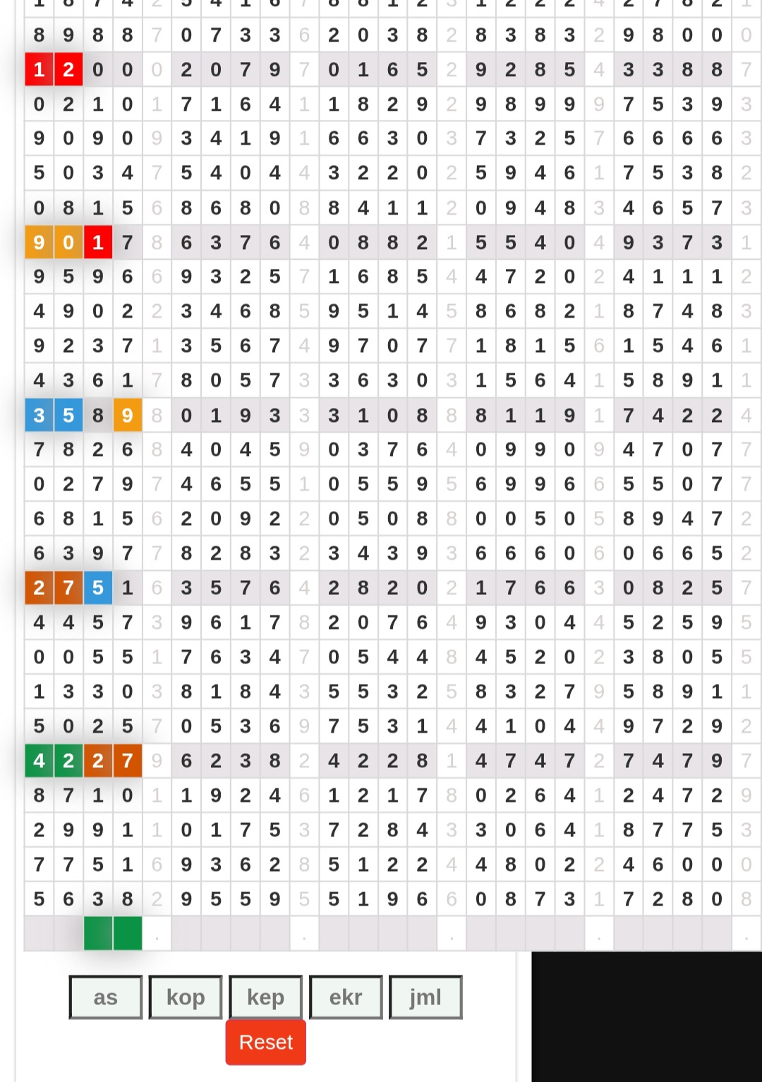 | Rumus Angka Mati berdasarkan kepala harian | 04 05 06 07 09 10 15 17 18 20 21 29 30 31 32 41 42 43 53 54 61 62 64 65 72 73 75 82 83 84 85 86 87 93 94 95 96 97 98 |