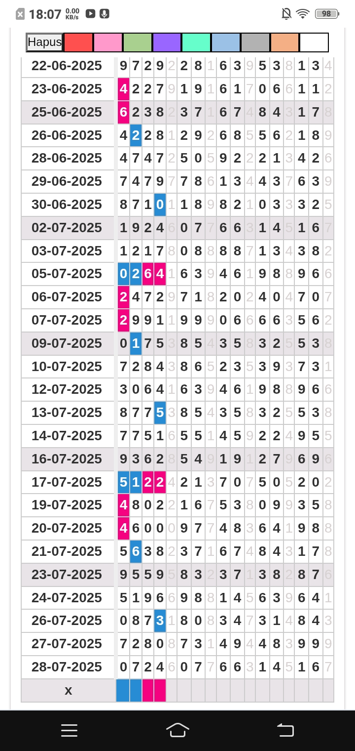 | Rumus Angka Mati berdasarkan kepala harian | 04 05 06 07 09 10 15 17 18 20 21 29 30 31 32 41 42 43 53 54 61 62 64 65 72 73 75 82 83 84 85 86 87 93 94 95 96 97 98 |