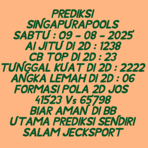 Prediksi Singapore Kamis, 25-09-2025 Merupakan Prediksi Otomatis yang menggabungkan Metode Kalender Togel Dengan LN Generator yang akurasi prediksinya sudah kita ketahui bersama. Jadi harap Maklum Jika kadang meleset Prediksi Singapore kita. Jadikan ini sebagai perbandingan saja dan tetap Utamakan karya sendiri