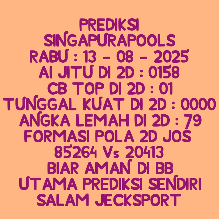 Prediksi Singapore Senin, 20-10-2025 Merupakan Prediksi Otomatis yang menggabungkan Metode Kalender Togel Dengan LN Generator yang akurasi prediksinya sudah kita ketahui bersama. Jadi harap Maklum Jika kadang meleset Prediksi Singapore kita. Jadikan ini sebagai perbandingan saja dan tetap Utamakan karya sendiri