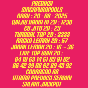 Prediksi Singapore Sabtu, 25-10-2025 Merupakan Prediksi Otomatis yang menggabungkan Metode Kalender Togel Dengan LN Generator yang akurasi prediksinya sudah kita ketahui bersama. Jadi harap Maklum Jika kadang meleset Prediksi Singapore kita. Jadikan ini sebagai perbandingan saja dan tetap Utamakan karya sendiri