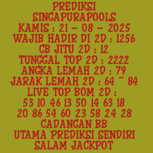 Prediksi Singapore Senin, 03-11-2025 Merupakan Prediksi Otomatis yang menggabungkan Metode Kalender Togel Dengan LN Generator yang akurasi prediksinya sudah kita ketahui bersama. Jadi harap Maklum Jika kadang meleset Prediksi Singapore kita. Jadikan ini sebagai perbandingan saja dan tetap Utamakan karya sendiri