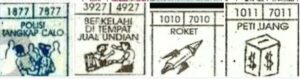 | Rumus Angka Mati berdasarkan kepala harian | 05 06 08 10 15 16 17 18 19 20 21 26 27 28 29 30 32 37 38 39 40 41 43 48 52 53 54 63 64 65 74 75 76 86 87 94 95 97 98 |