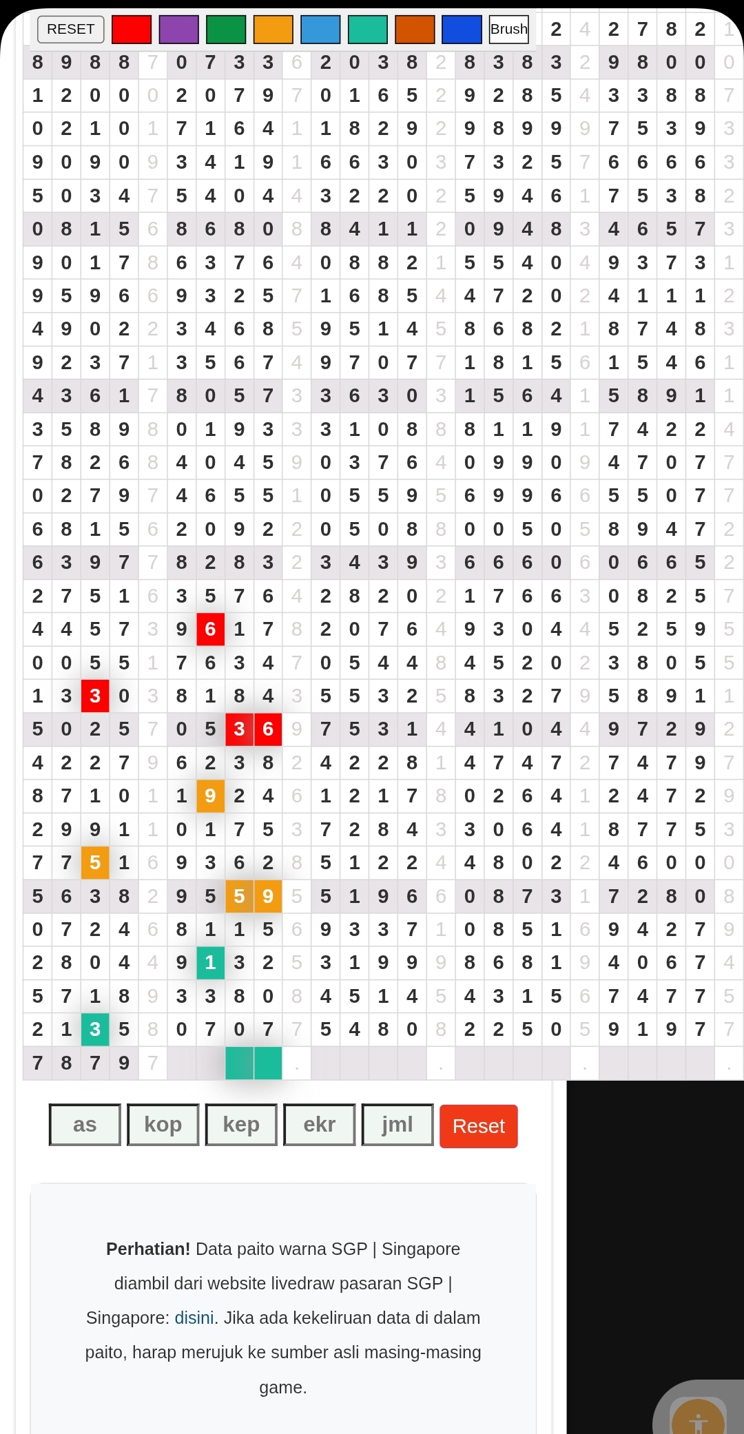 | Rumus Angka Mati berdasarkan kepala harian | 04 05 06 07 09 10 15 17 18 20 21 29 30 31 32 41 42 43 53 54 61 62 64 65 72 73 75 82 83 84 85 86 87 93 94 95 96 97 98 |