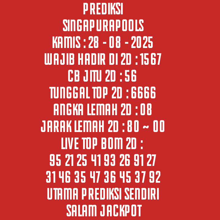 Yth, Kami informasikan bahwa result TOTO Singapore pada hari Kamis tanggal 28 Agustus 2025 mengalami pengunduran dimana Jam tutup pasaran tetap yaitu pada pukul 17:30 WIB dan result keluar kisaran pukul 20:45 WIB