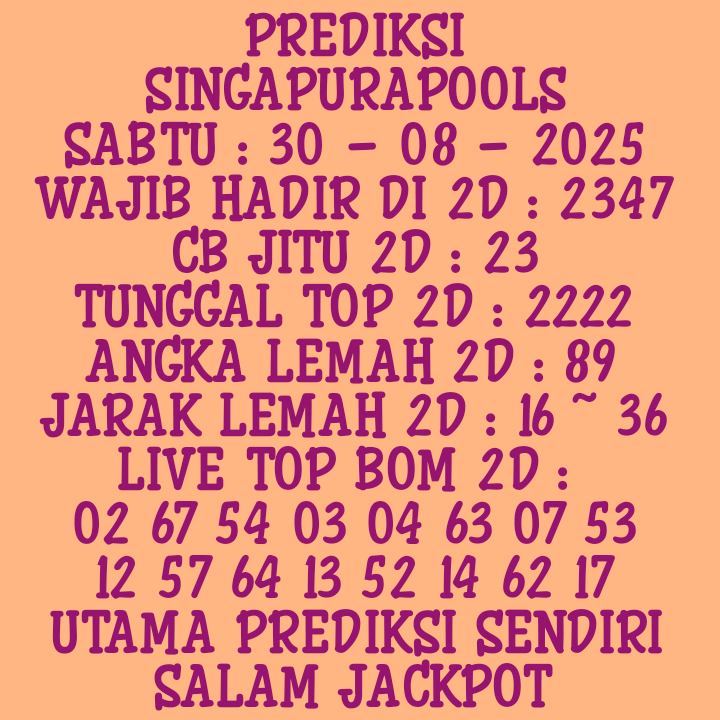 Prediksi Singapore Minggu, 02-11-2025 Merupakan Prediksi Otomatis yang menggabungkan Metode Kalender Togel Dengan LN Generator yang akurasi prediksinya sudah kita ketahui bersama. Jadi harap Maklum Jika kadang meleset Prediksi Singapore kita. Jadikan ini sebagai perbandingan saja dan tetap Utamakan karya sendiri