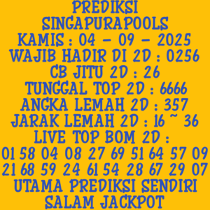 Prediksi Singapore Sabtu, 11-10-2025 Merupakan Prediksi Otomatis yang menggabungkan Metode Kalender Togel Dengan LN Generator yang akurasi prediksinya sudah kita ketahui bersama. Jadi harap Maklum Jika kadang meleset Prediksi Singapore kita. Jadikan ini sebagai perbandingan saja dan tetap Utamakan karya sendiri