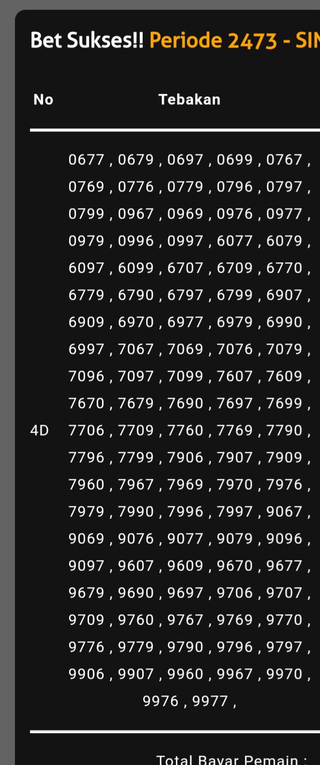| Rumus Angka Mati berdasarkan kepala harian | 05 06 08 10 15 16 17 18 19 20 21 26 27 28 29 30 32 37 38 39 40 41 43 48 52 53 54 63 64 65 74 75 76 86 87 94 95 97 98 |